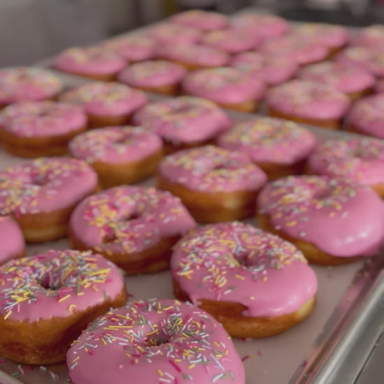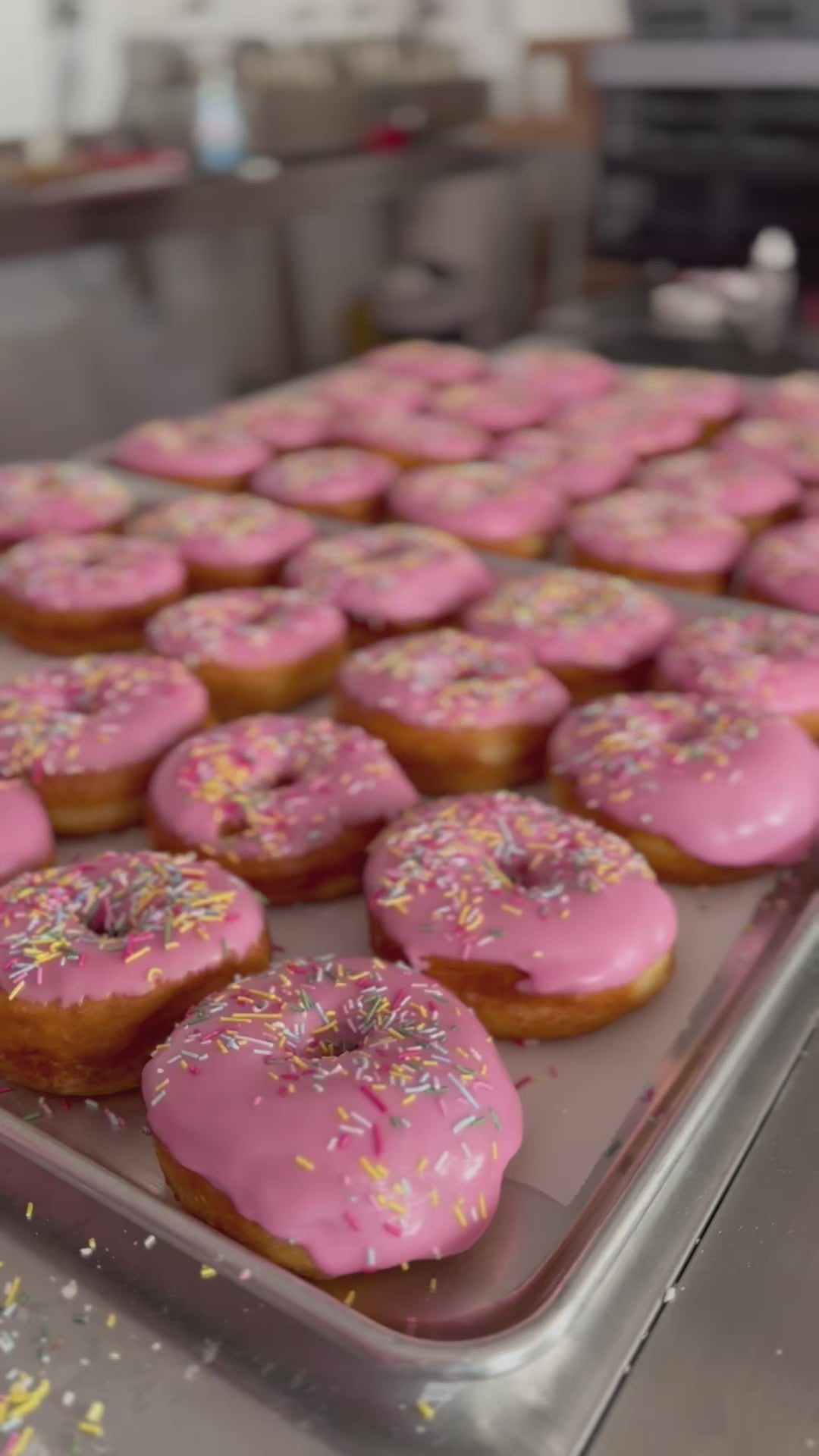 Fresh dough with a sweet raspberry glaze and a smattering of sprinkles. An absolutely drool worthy, vegan friendly classic.